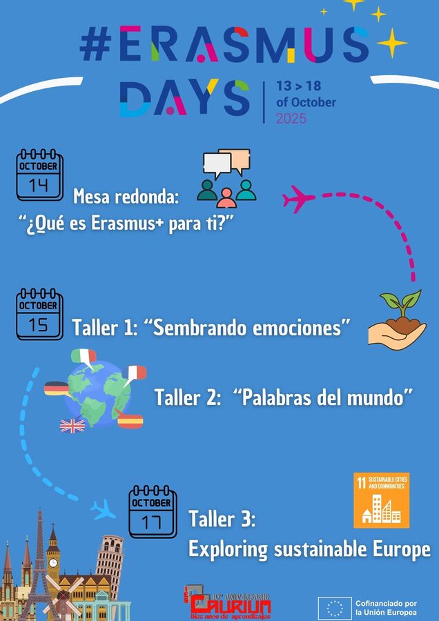 Os adjuntamos el programa de las actividades #Erasmusdays2025 que celebraremos durante la presente semana. En el día de hoy, en el recreo en el salón de actos, llevaremos acabo una mesa redonda: «¿Qué es para ti Erasmus+?» en la que dos alumnos, dos profesoras participantes y el coordinador del proyecto KA122 compartirán sus experiencias y responderán a algunas preguntas sobre nuestro programa Erasmus+. Además, lo retransmitiremos por el canal de Youtube del centro.